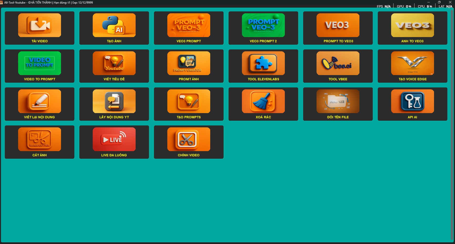 ALL TOOL là bộ TÍCH HỢP 20+ công cụ AI cho YouTuber / MMO / Content Creator Việt Nam trong 1 phần mềm duy nhất. Thay vì mua hàng chục tool lẻ với giá triệu đồng mỗi tháng, bạn có đầy đủ mọi thứ cần làm content — từ A đến Z — chỉ trong 1 giao diện.